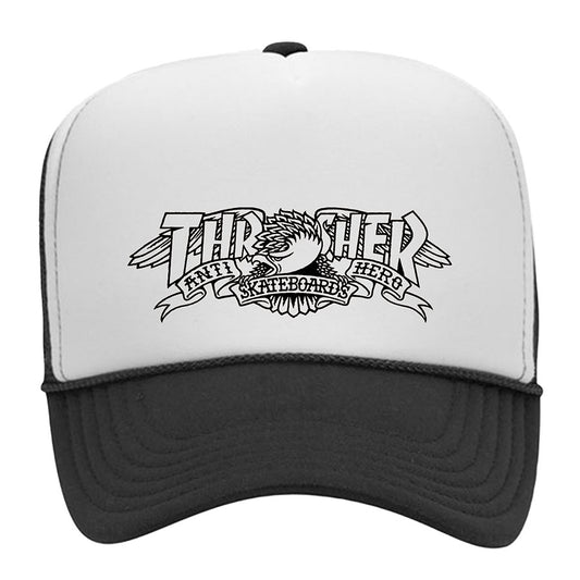 SKU: 210000178621AVAILABILITY: Out of StockPRODUCT TYPE: Men's Accessories - Men's HatsVendor:VENDOR: Anti-HeroAnti-Hero Skateboards x Thrasher Magazine Trucker HatFeatures: Monochromatic design Anti-Hero Eagle with Thrasher Banner