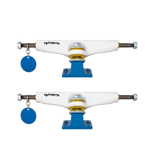 SKU: 210000191975AVAILABILITY: Out of StockPRODUCT TYPE: Skate Accessories - TrucksVendor:VENDOR: IndependentIndependent Truck Company Mark Gonzales Pro Stage 4 trucks featuring flat-white printed hanger, blue fine texture baseplate with Shmoo stamp, logo printed yellow cushions, silver hardware, and laser etched aluminum keychain hangtag.Stage 4s feature the original Stage 4, single wing...