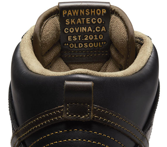 Old souls with a passion for skate boarding's future, the Nike SB Dunk High by Pawnshop channels their lifelong love and salt-of-the-Earth drive in a work boot-inspired Dunk with gold detailing and graphics calling back to custom culture. Built from the OG Dunk tooling, the Pawnshop Dunk High mixes splashes of gold with the black colorway and co-branding on the tongue and insole, “OLDSOUL” messaging, and two sets of laces with gold aglets