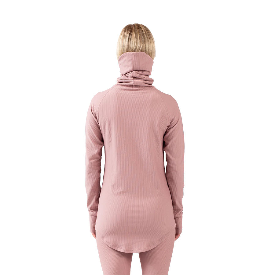 Be extra toasty in this pink ribbed sports base layer that combines street-fashion and maxed out functionality. The extended back and the integrated soft and fleece lined gaiter neckwarmer cut higher in the back to easily tuck it under the helmet or beanie for extra warmth, protects you on cold winter days through every weather. Stay comfortable through cold mountain days, outdoor adventures, or even a calm moment in the yoga studio.