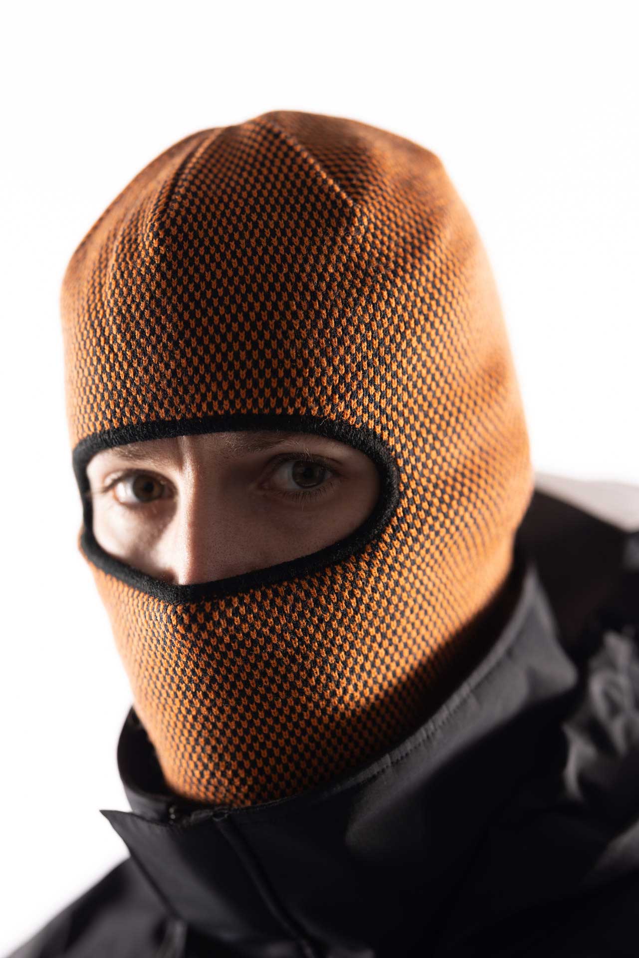 A heavy-weight acrylic facemask in rib knit, with contrast eye opening and a canvas printed label.
