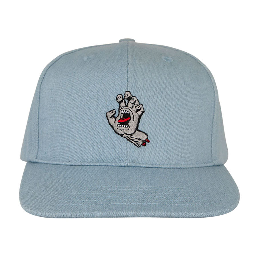 The Santa Cruz Screaming Hand mid profile fit, 6 panel structured snapback hat, twill-faced, foam and mesh hat features direct embroidery at front, sweatband label and custom interior taping.