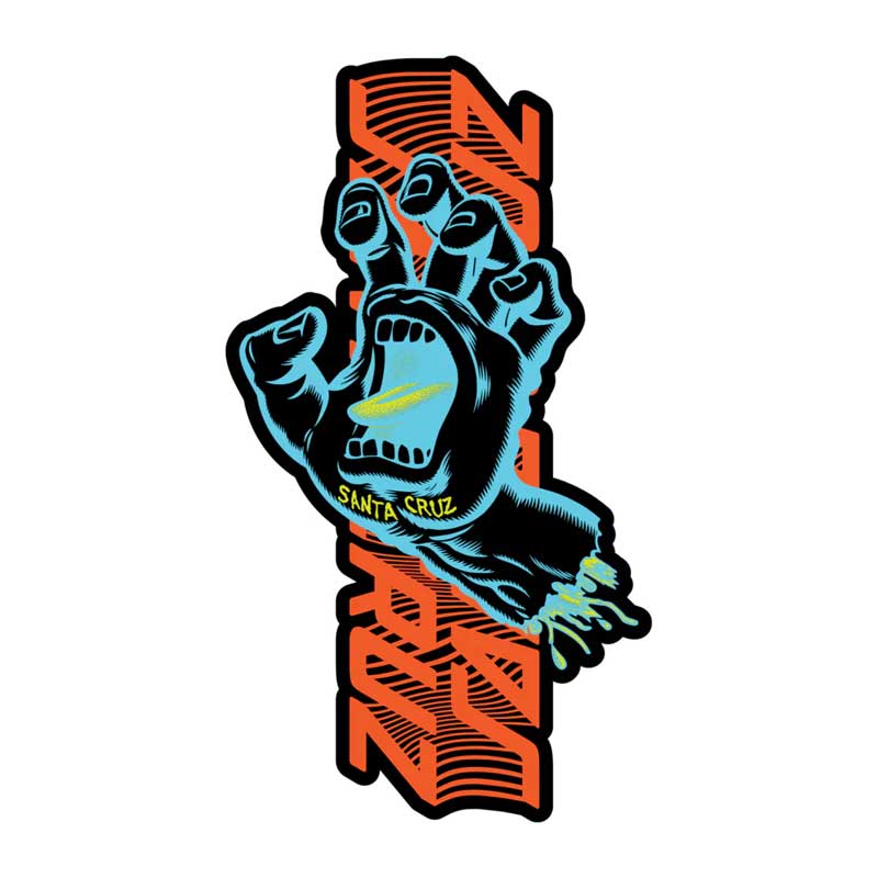 The Split Strip Hand Sticker combines classic Screaming Hand and Santa Cruz Strip artwork from Jim Phillips.